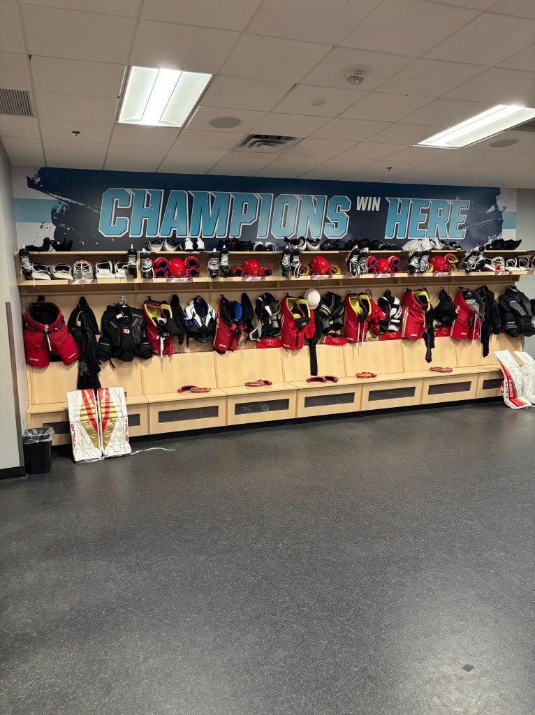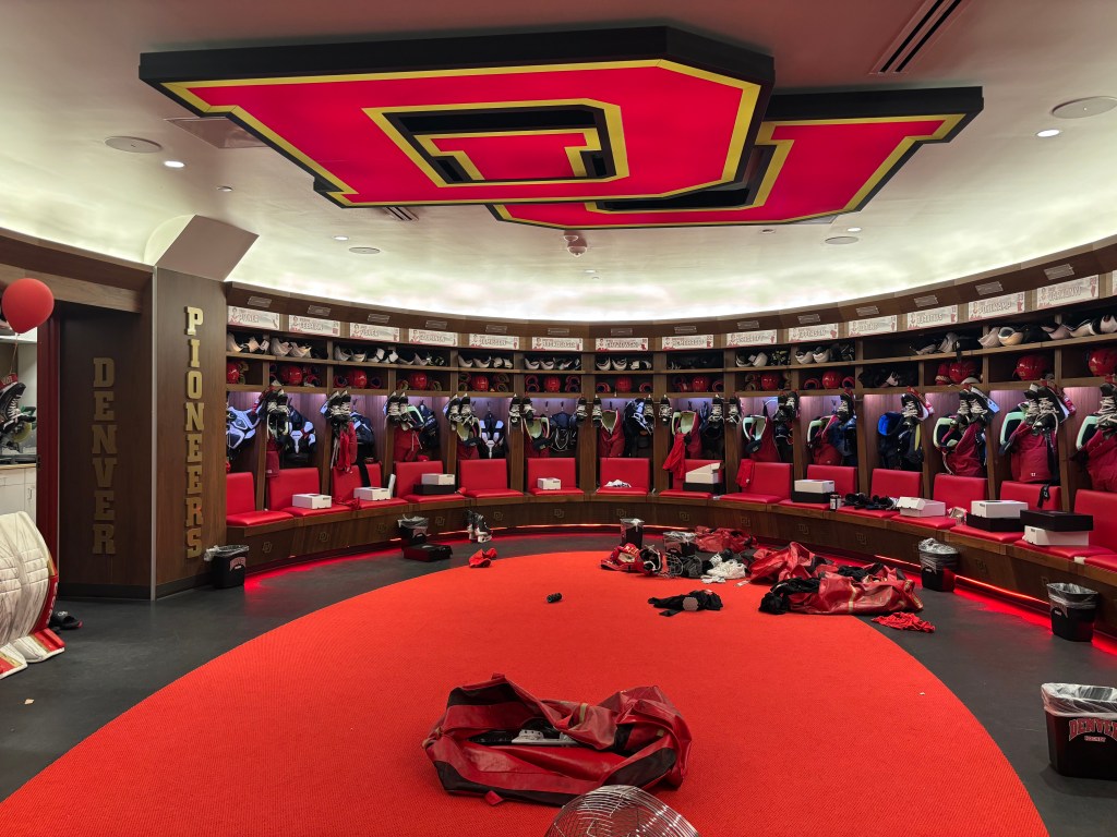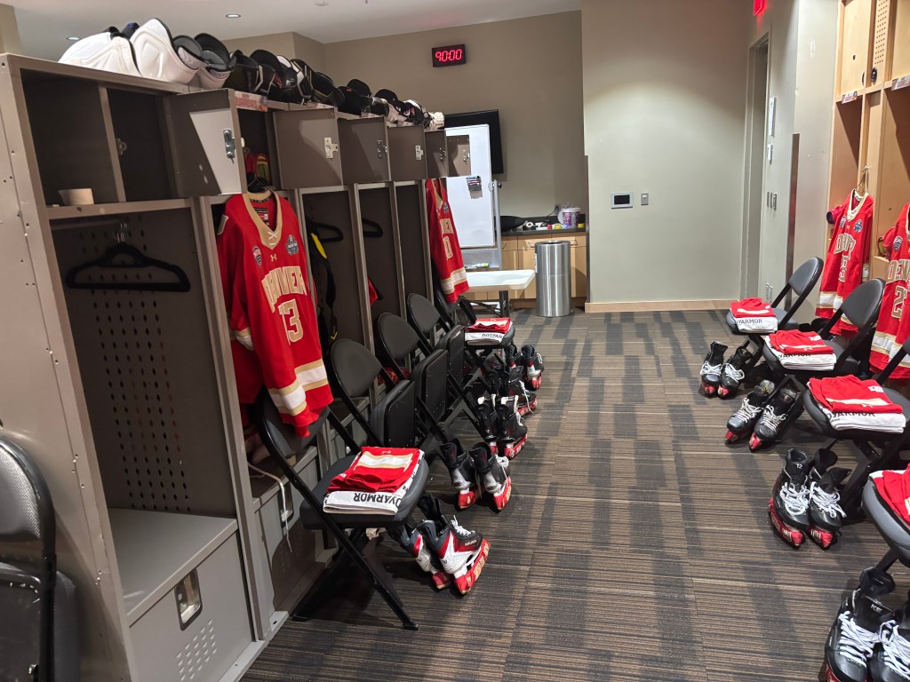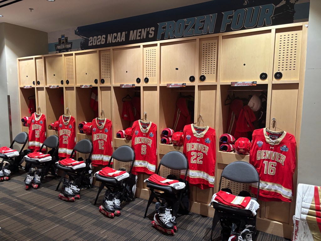 My goal for this photo gallery was to highlight the behind-the-scenes work that goes with DU hockey, particularly the equipment staff, from leaving for the Frozen Four and putting patches and stickers on, to being there, winning the National Championship, and coming back to DU and the mess our room was. While most people only see the games, these images highlight the preparation, organization, and cleanup required, and the daily routines that happen off the ice. From the locker room to clean up and set up, to equipment details and the Frozen Four environment, every part plays a role. As ESPN said during the championship run, “the standard is the standard, and the standard is Denver,” and these photos show what that standard looks like every day.
